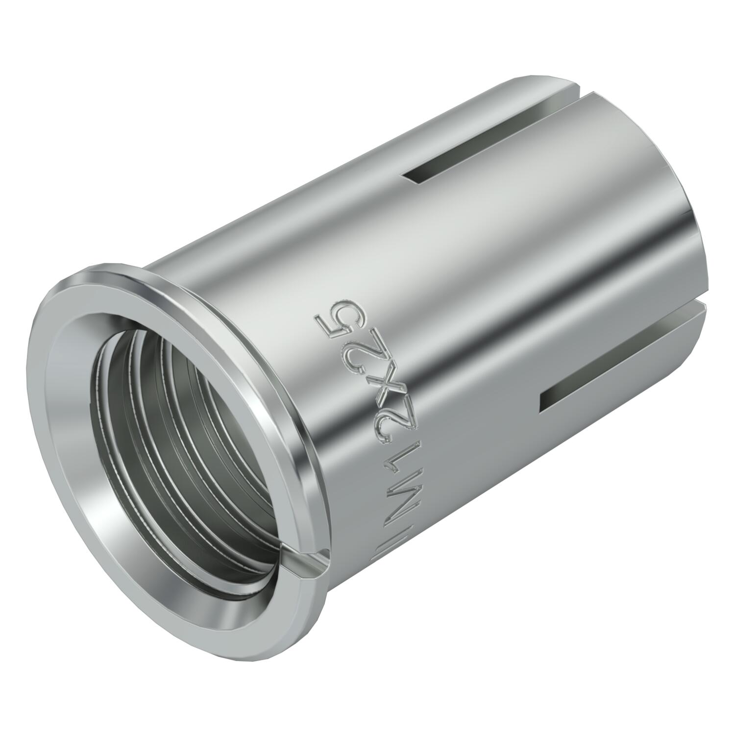 Product descriptionDrop-in anchor for multiple fastening, with internal thread in steel, for the anchoring of, for example, cable tray systems, consoles, steel conctructions, etc. in uncracked concrete in indoor and outdoor areas. To knock in with a hammer. With an edge to prevent the anchor from being pulled in. Rustproof and highly corrosion-resistant. The anchor sleeve tightens against the drill hole wall when the internal pin is knocked in, e.g. using the manual firing tool EHS M. Fire-safety tested, fire protection class R 120 according to European Technical Assessment ETA-07/0135 for concrete.