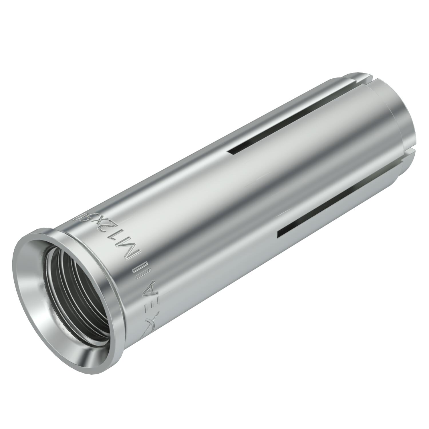 Product descriptionDrop-in anchor for multiple fastening, with internal thread in steel, for the anchoring of, for example, cable tray systems, consoles, steel conctructions, etc. in uncracked concrete in indoor and outdoor areas. To knock in with a hammer. With an edge to prevent the anchor from being pulled in. Rustproof and highly corrosion-resistant. The anchor sleeve tightens against the drill hole wall when the internal pin is knocked in, e.g. using the manual firing tool EHS M. Fire-safety tested, fire protection class R 120 according to European Technical Assessment ETA-07/0135 for concrete.