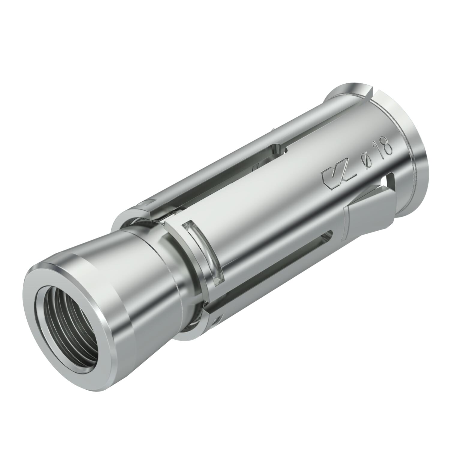 Product descriptionHollow core anchor with internal thread for anchoring, for example, cable tray constructions, pipes, suspended ceilings, wooden constructions, etc. on walls and ceilings made from stressed concrete hollow-core slabs in indoor and outdoor areas. With an edge to prevent the anchor from being pulled in. When the fastening screw is screwed in the expansion sleeve is spread open through the cone and tightens against the drill hole walls. Fire-safety tested, fire protection class R 120 according to European Technical Assessment ETA-21/0857.