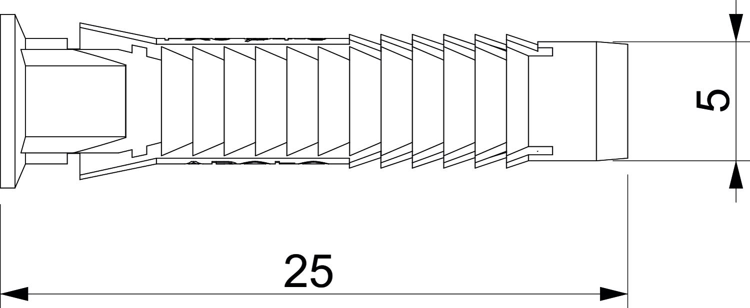 Colour Light grey Diameter 5 mm Dimension 5x25 Dimension D 5 mm Dimension L 25 mm Drill hole diameter, min. 5 mm Length 30 mm Material Polyethylene Pull-out value 200 N Suitable for fastening with cable ties no Suitable for hexagonal wood screw yes Version for Universal anchor With bolts no Wood screws 2,5-4 - All types