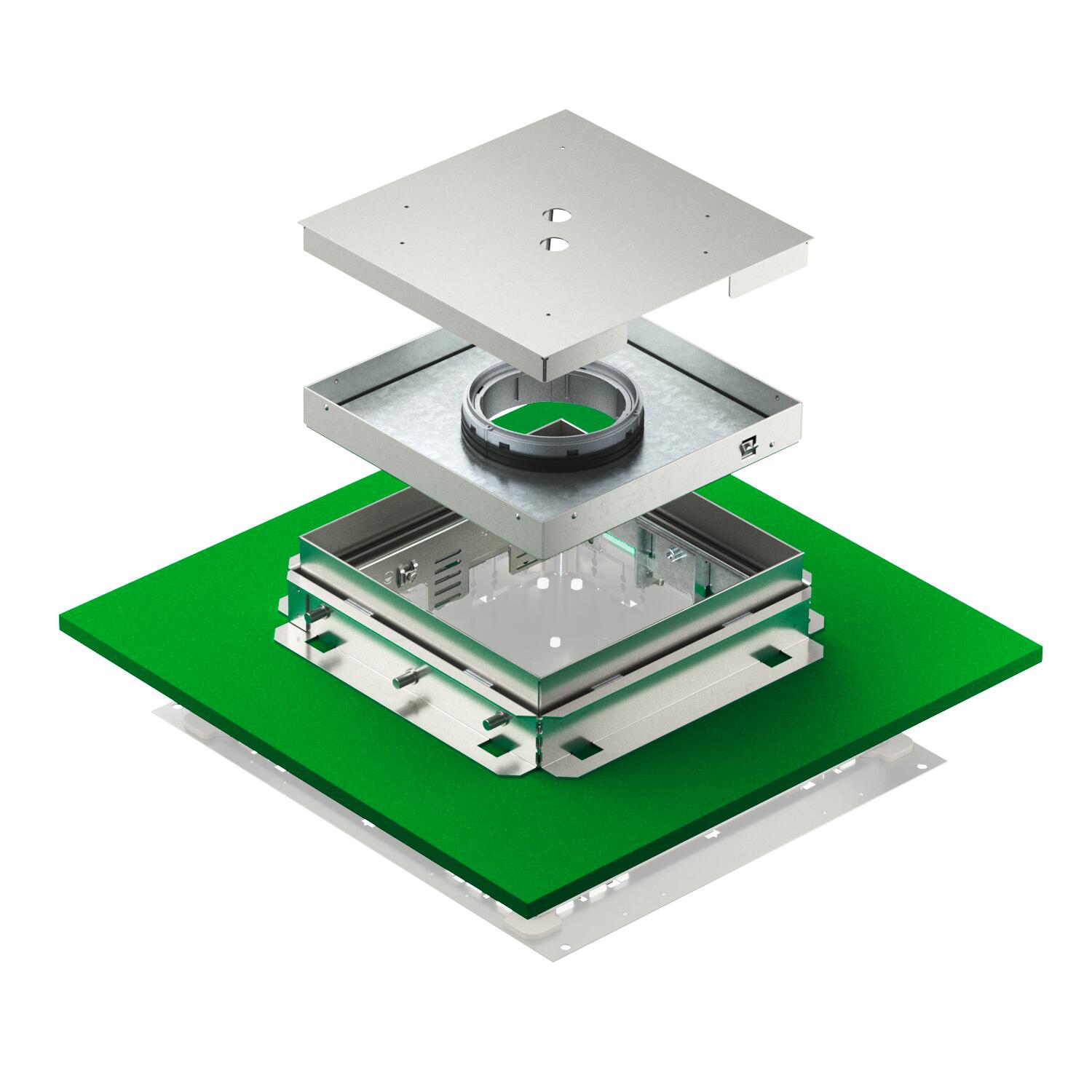 Опис продуктуHeight-adjustable and decouplable square cassette for flush-floor and jointless device installation in underfloor connection sockets UZD 350-3 (minimum installation depth 151 mm)/UGD55 350-3 (minimum installation depth 136 mm). Suitable for all cement screeds. Cassette frame with integrated lined body and height-adjustment function. The height of the cassette frame is adjusted to the top edge of the floor covering using four slots. Suitable for dry, moist or wet-cleaned floors. The cassette is fixed in the mounting cover by fastening brackets during screed/Terrazzo work and is decoupled in all directions in the installed state. The cassette frame is made of stainless steel with a 25 mm-deep floor covering recess in the lid.