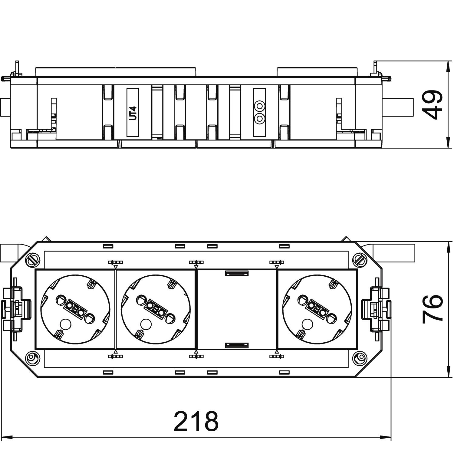 Готовий до підключення розетковий супорт UTC4 має 2 попередньо встановлені розетки з захисним контактом 33 ° помаранчевого кольору та попередньо встановлену розетку із захисним контактом 33 ° зеленого кольору та заглушку для подальшої установки установочного пристрою з модуля Modul45 або Модуль 45connect серії, 250 В ~ 16 А. ПВХ- З'єднувальний кабель зі штекером, 3-контактний, тип WINSTA® MIDI. Підходить для підключення кабелів VL та розеткових люків номінальним розміром R7, R9 та 9.