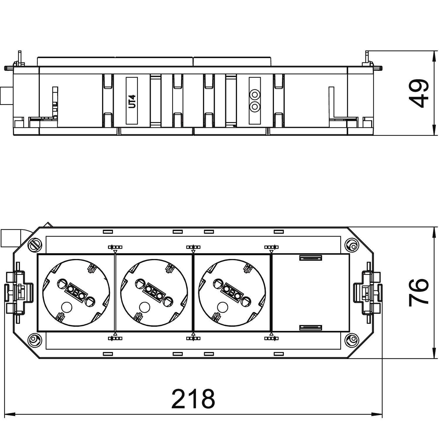 Опис продуктуГотова до підключення універсальний розетковий супорт UTC4, має 3 попередньо встановлені білі розетки із захисними контактами 33° та заглушку для наступної установки пристрою Modul45.