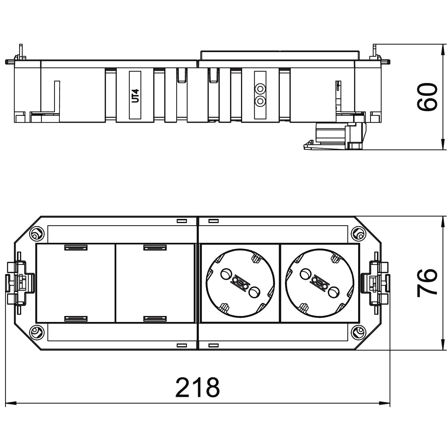 Опис продуктуГотовий до підключення універсальний супорт UTC4 має дві попередньо встановлені розетки із захисними контактами 33°, 16 А ,та дві заглушки для подальшої установки двох установочних пристроїв серій Modul 45 або Modul 45connect. Підходить для підключення кабелів VL та розеткових люків номінальним розміром R7, R9 та 9.